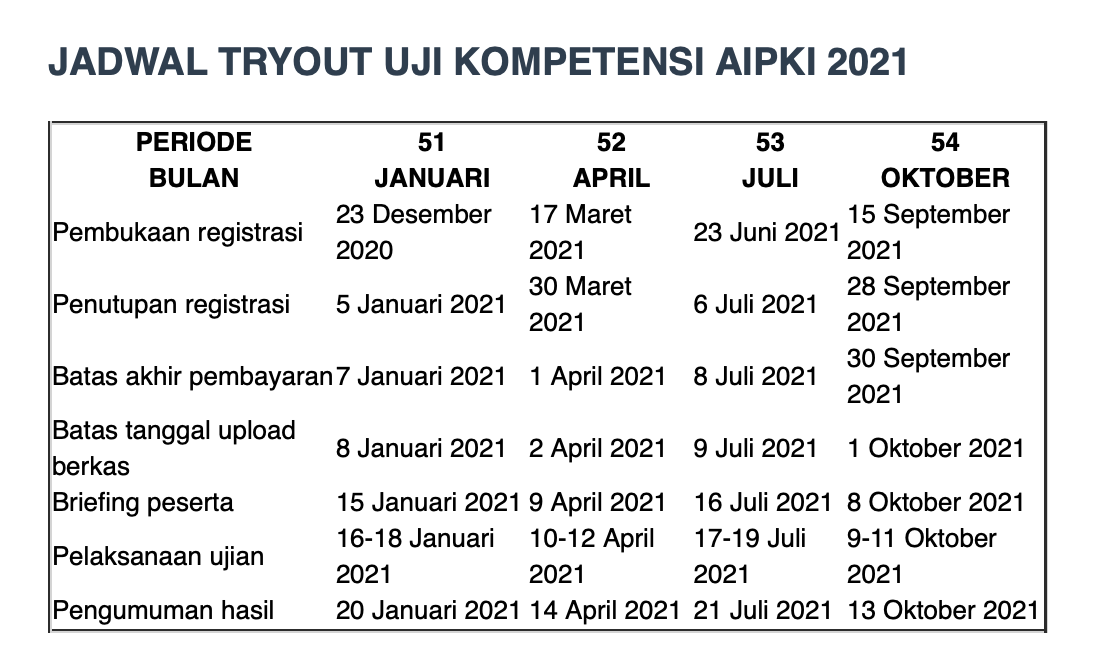 Tata cara serta jadwal lini masa pendaftaran dan pelaksanaan TO UK AIPKI tahun 2021 dapat dilihat pada laman to.aipki.org